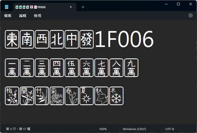 2.以 Mahjong Tiles 這個類別當範例,開啟 Mahjong Tiles PDF 後,我們可以看內含的所有符號及符號的 Unicode 代碼。若想將這些符號運用到記事本內,我們可以輸入要應用的 Unicode 代碼,如下圖: