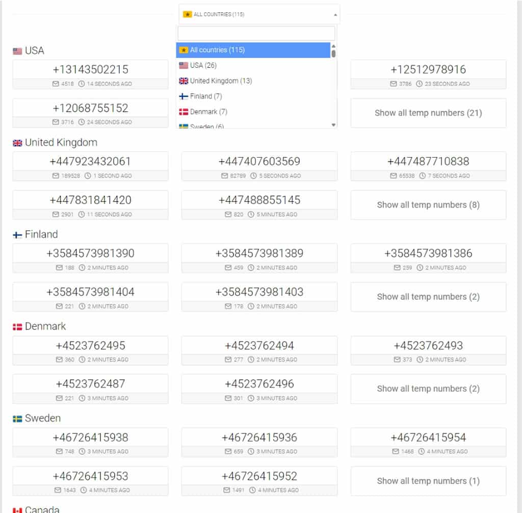 2.首頁則會列出該國家可用來接收簡訊的電話號碼,可利用下拉式選單進行篩選。