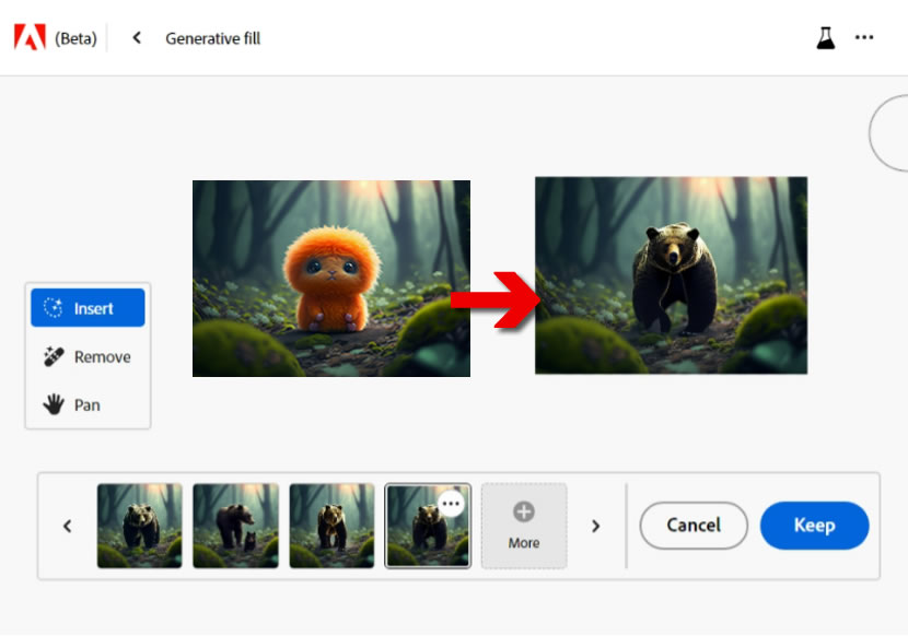 Adobe Firefly 的 Generative fill 功能同樣基於生成式 AI 技術,但提供了更進一步的功能。使用者可以透過簡單的文字指令,創造、添加、移除或替換圖片中的內容。這意味著當圖片中的區域被移除時,使用者可以通過文字指令告訴 AI 該區域應該加入的內容物。這可以是與圖片相符的背景,也可以是使用者自己的創意想法,例如「一隻貓」、「一棵樹」。
