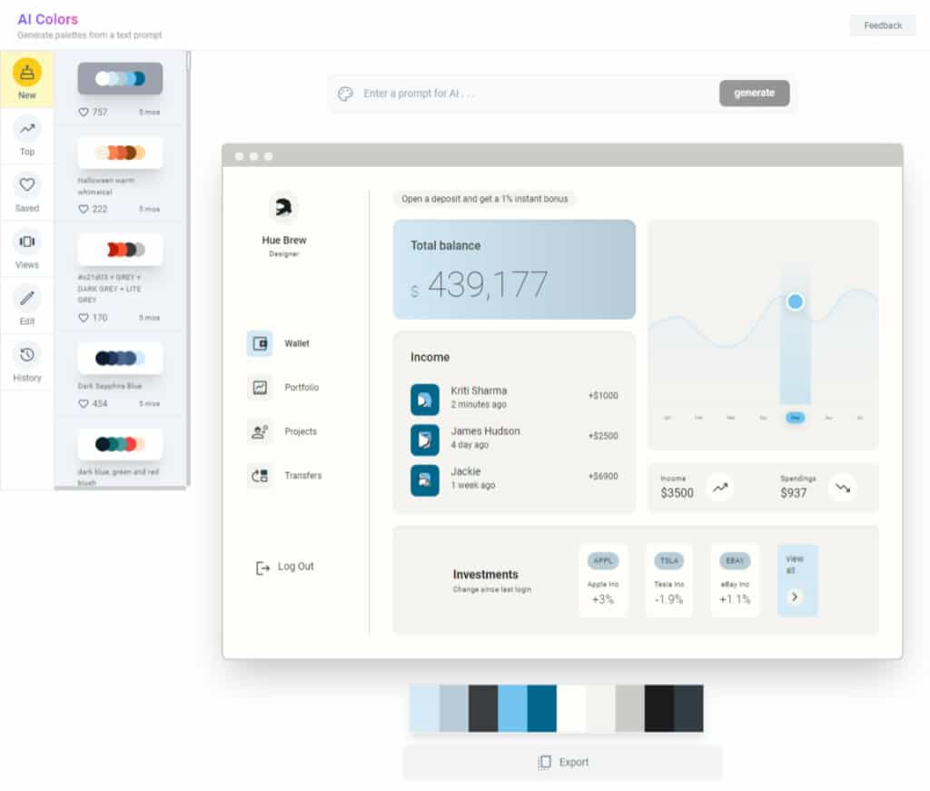 AI Colors 是一個免費的線上工具,專為生成完整的顏色搭配解決方案而設計。使用者可以選擇現有的搭配方案,或者根據需求使用文字指令(Prompt)來描述所需的色彩解決方案,然後交由 AI Colors 來生成。生成的配色方案可套用到網頁、Mobile App、Dashboard、Portfolio 及 Landing Page 範本上,讓使用者能夠預覽這些顏色在實際應用上的效果,同時還可以輸出適用於 CSS 的 HEX 色碼。這對於沒有美術背景的設計者來說,是一個能夠輕鬆設計出有美感的顏色搭配工具。AI Colors 的使用無需註冊,且沒有使用次數的限制。無論是專業設計師還是初學者,都可以輕鬆使用 AI Colors 生成吸引人的顏色搭配方案。