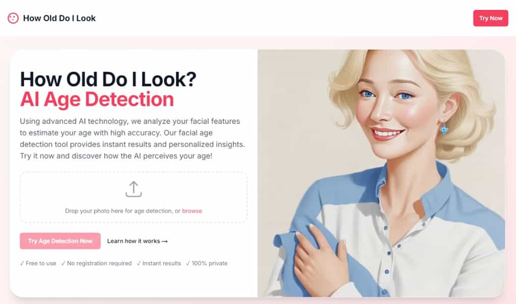 自己在照片中看起來比實際年齡是更年輕或更成熟?現在,不用再四處詢問他人,只需使用 How Old Do I Look,這個免費 AI 照片年齡檢測工具,即可輕鬆獲得答案!該網站使用的 AI 模型已經對不同年齡、不同種族、不同光照條件的數百萬張臉進行了訓練,以提供盡可能最準確的年齡估計,因此,使用者僅需上傳自己含有臉部的照片,幾秒鐘內即可獲得臉部年齡分析。How Old Do I Look 的年齡檢測工具,無需建立帳戶,也無使用次數限制。