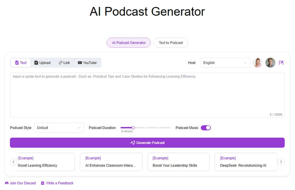 1.進入 AIVocal AI Podcast Generator 後,無需註冊帳號,可以直接開始使用。其腳本來源有文字、檔案上傳、連結、和 YouTube 四種模式。
