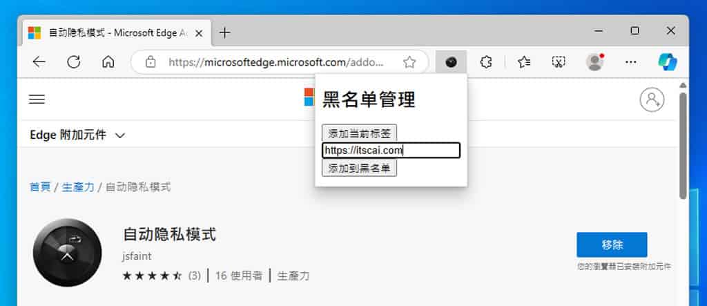「自動隱私模式」是以網域名稱為主要判斷依據,因此,串接在網域後的網址,例如 https://itscai.com/xxxxxx 都會以 InPrivate 視窗開啟。