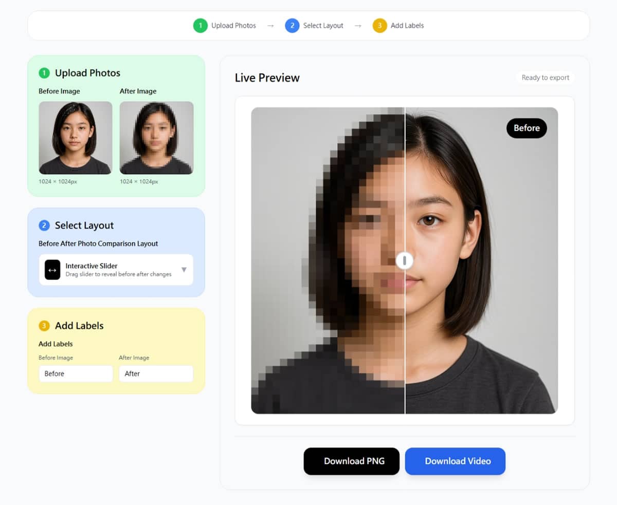 滿意你的作品後,點擊「下載」按鈕就能儲存到電腦或手機裡。支援 PNG 格式,另外,如果是選擇滑動對比版面(Interactive Slider),還會多了「Download Video」 的按鈕,可以將成品下載成 mp4 影片檔。