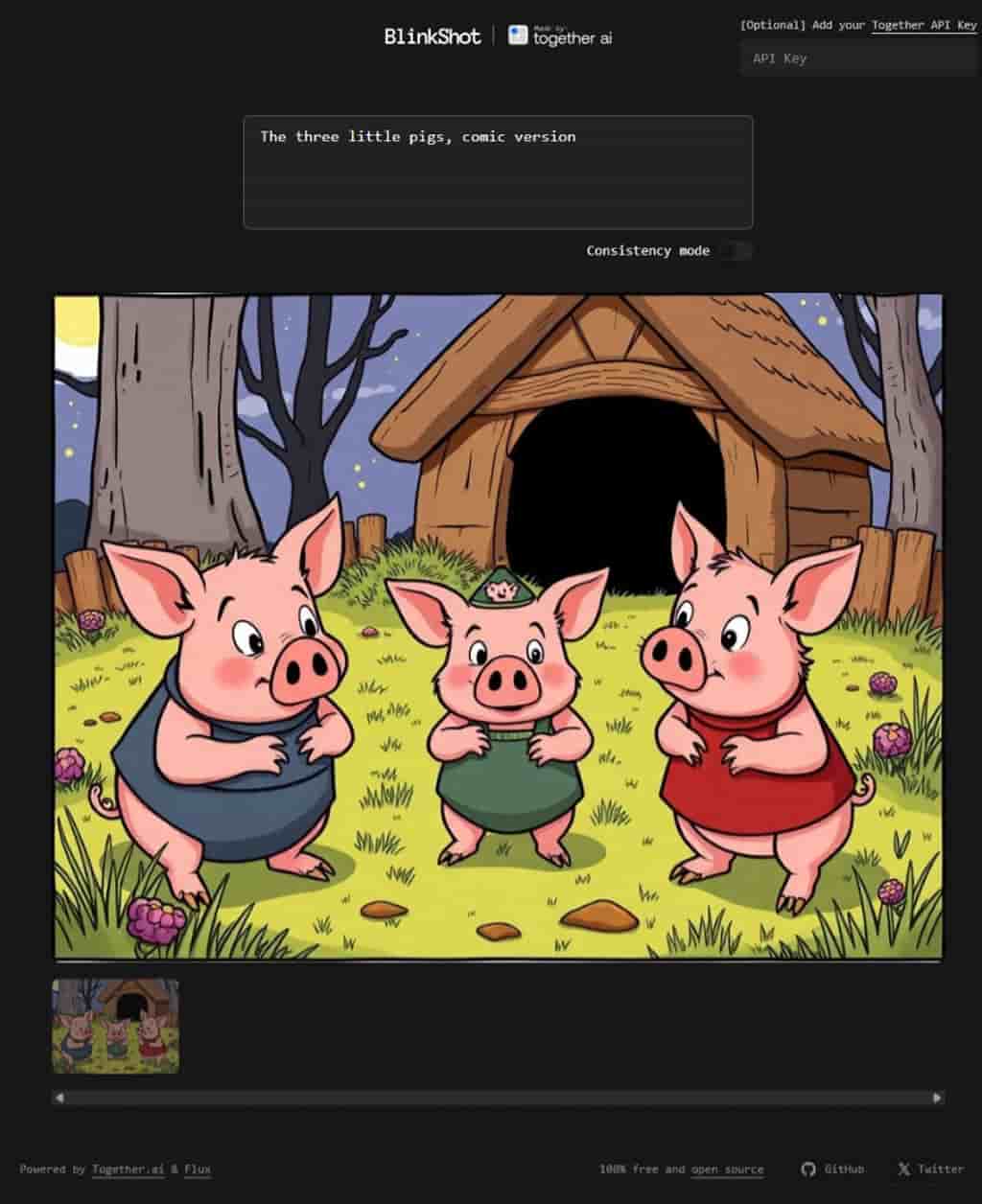 BlinkShot 是一個專為即時生成圖像而設計的開源線上 AI 繪圖工具。基於 Together AI 平台的 Flux 模型,BlinkShot 能在極短的時間內生成符合文字描述(Prompt)的圖像,過程無需註冊帳戶,且不限使用次數,完全免費。BlinkShot 頁面設計的相當簡潔與直觀,使用者完全不需要額外學習如何操作,只需將構想轉化為文字,即可快速生成相應的圖像。另外,BlinkShot 還提供 Consistency mode 選項,可讓圖像生成保持一致性,例如相同人物樣貌但搭配不同場景。