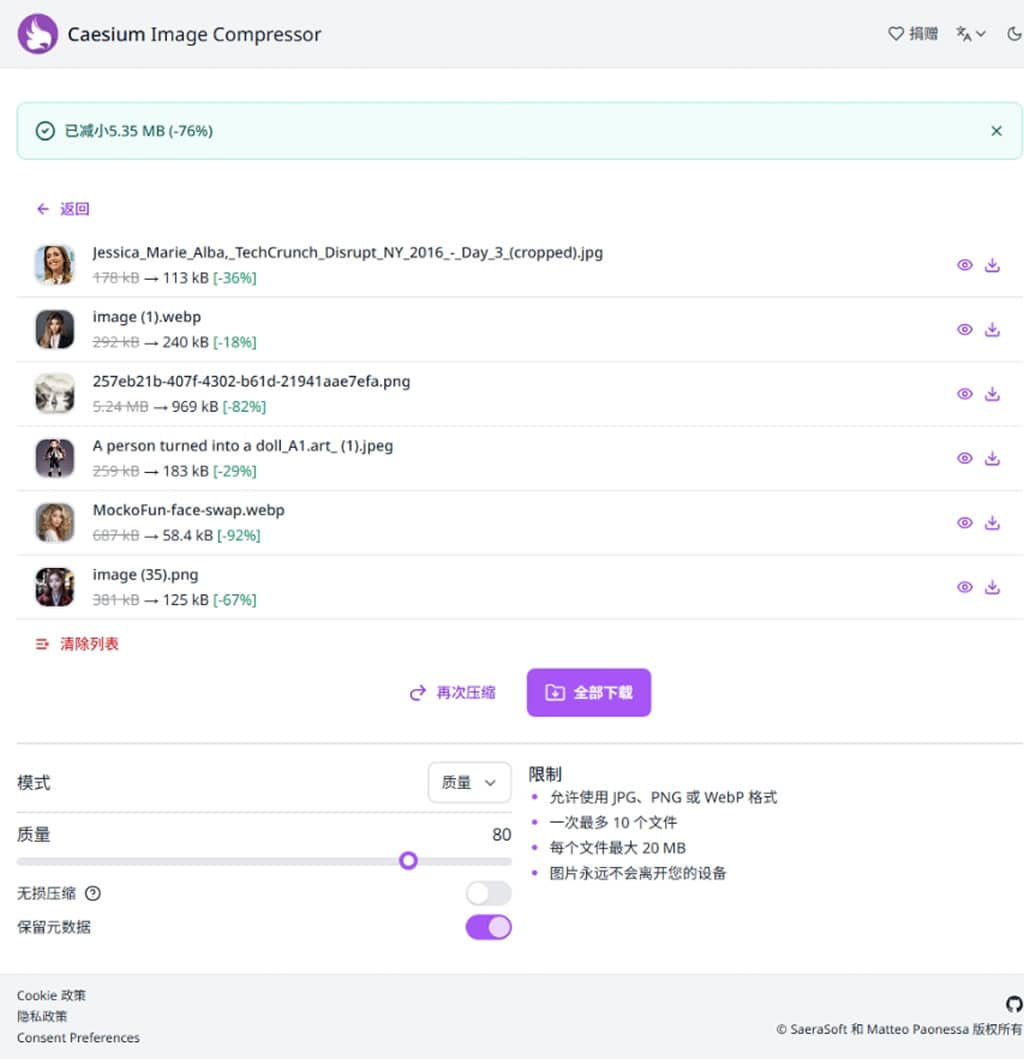 Caesium Image Compressor Online 具有以下特點: