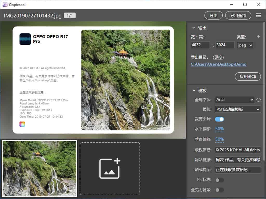 Copicseal 是一套開源且免費的 EXIF 水印工具,主打自動解析照片中的快門速度、ISO、光圈、焦距、拍攝時間等 EXIF 資訊,並支援以這些相機參數作為水印內容展現。使用者可從多種預設模板中選擇(如白色邊框、圓角、時間戳、文字內嵌、PS 啟動畫面樣式等),輕鬆拖拽調整位置,即時預覽所見即所得(WYSIWYG),操作直覺且不上手 。此外,它採用單檔打包、零依賴安裝方式,啟動快速、佔用資源低,適合不想裝一堆環境的使用者 。
