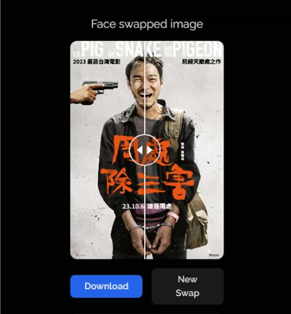 3.選擇好圖片後,點擊「Swap Face」按鈕就會開始換臉處理,完成後,可用滑鼠拖動中間分隔線比較換臉前後。