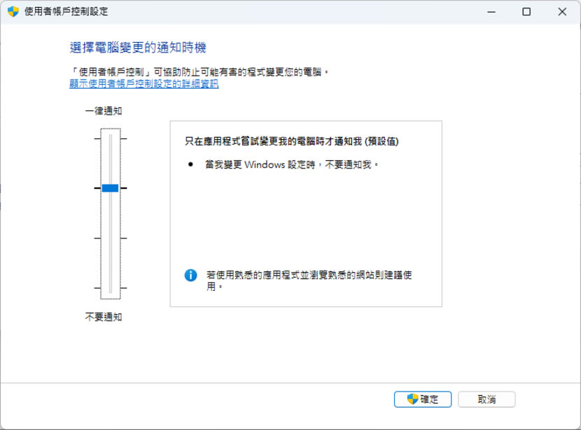 7.等級越往上安全性越嚴格,所以我們只需要將等級降低即可讓 UAC 處在沒有作用的狀態下,日後,如果想恢復,也只需在此處將安全等級恢復即可。