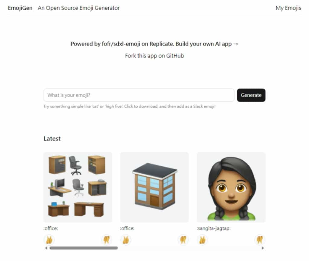 EmojiGen 是一個線上表情圖片生成器,專為製作符合文字描述的表情圖片而精心打造。這個工具採用了基於 Apple 表情符號風格的 fofr/sdxl-emoji 模型,再經 Stable Diffusion XL 的微調而成,且以開放原始碼的方式釋出。使用的方式也簡單,只要使用者輸入相關表情的文字描述,EmojiGen 即可生成一張無浮水印、大小為 512x512 的 PNG 表情圖片供使用者下載。EmojiGen 的使用方式簡單,無使用次數限制,無需註冊,也不採用積分制度,可以盡情使用,完全免費且無負擔的製作獨特表情圖片。
