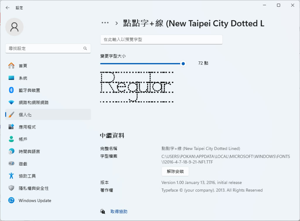 4.完成安裝後的字型,可以在「 設定 > 個人化 > 字型」視窗中預覽和解除安裝。