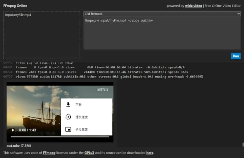 完成後,可以直接在線上預覽並下載,當然,你也修改指令自行轉換成其他影片格式。