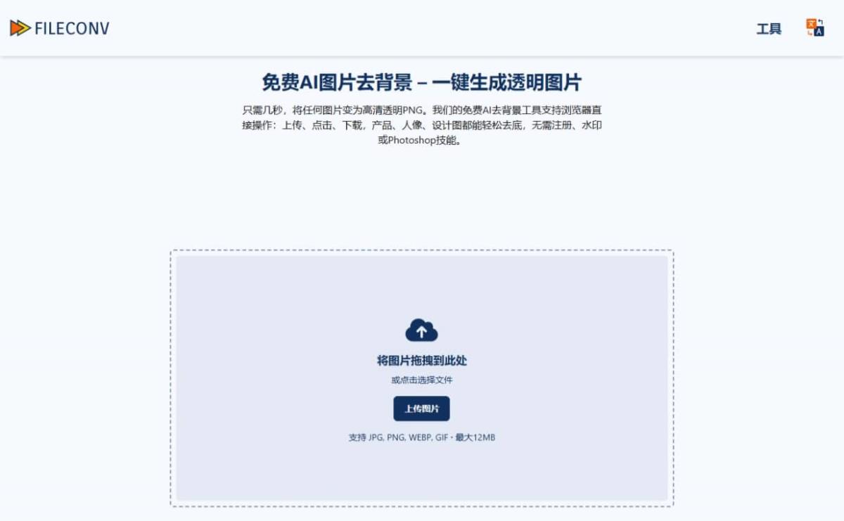1. 進入 FileConv Online Remove BG 網站,無須註冊即可上傳要移除背景的圖片,支援 JPG、PNG、WebP、GIF 等主流圖片格式,但檔案不得超過 12 MB。官網上有建議使用解析度高、主體邊緣清晰的圖片,才能獲得更好的去背效果。