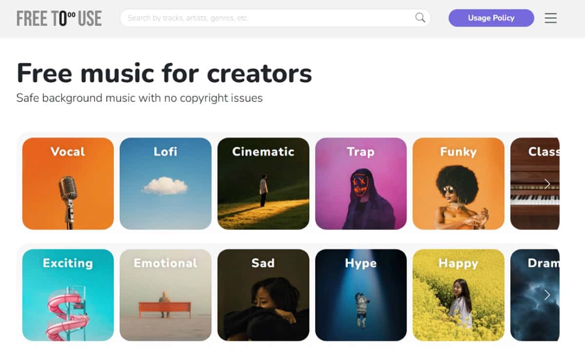 Free To Use是一個提供超過 1,400 首高品質背景音樂,完全免費下載使用,而且連註冊帳號都不需要的資源型網站。根據官網的介紹,這個平台專為 YouTube、Instagram、TikTok 等社群平台的創作者設計,讓你能夠安心使用安全的背景音樂,不用擔心版權問題。對剛起步的創作者來說,這無疑是最佳選擇之一。