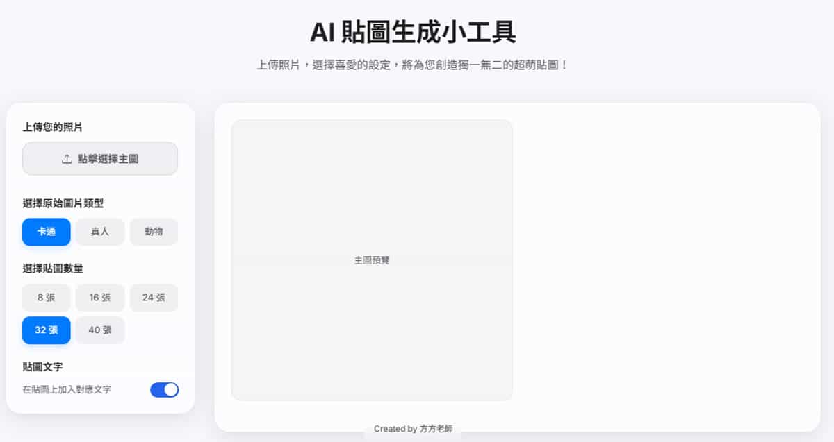 2.圖片上船後,接下來選擇圖片類型:「卡通」、「真人」或「動物」、設定貼圖數量,可選擇 8 張、16 張、24 張、32 張、40 張。貼圖文字功能預設為開啟,若不需要可手動關閉。另外,參考風格 (選填),可提供一張喜歡的畫風圖片,AI 會試著模仿該風格來繪製角色。這讓成品更有個人特色。