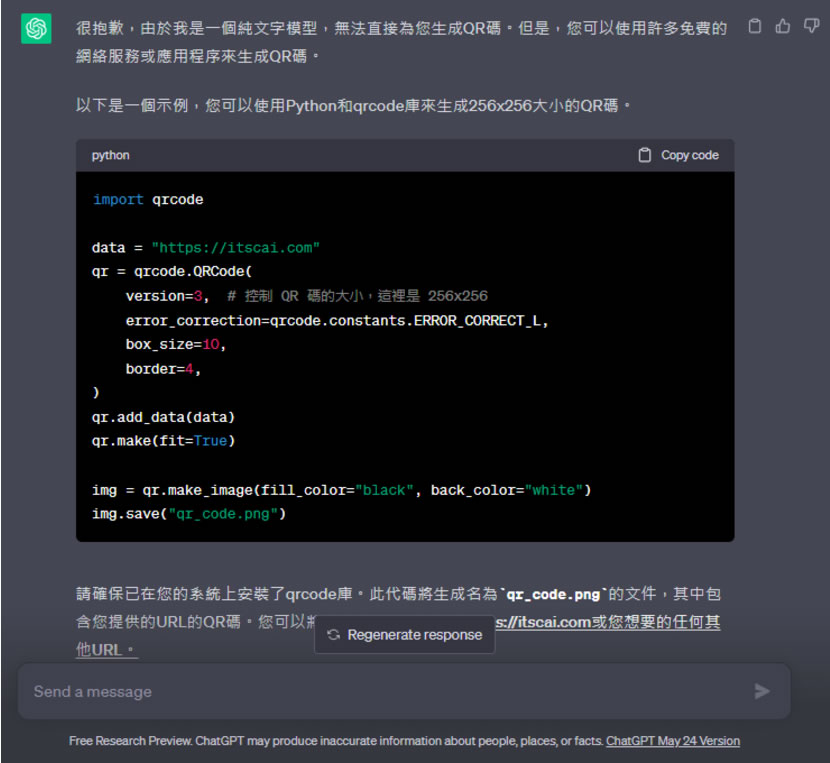 1.要讓 ChatGPT 產生二維條碼,重點就是要下對指令,以本站網址為例,如果使用:「幫我產生 256x256 https://itscai.com 的 QR Code」就會得到如下圖的回覆 。