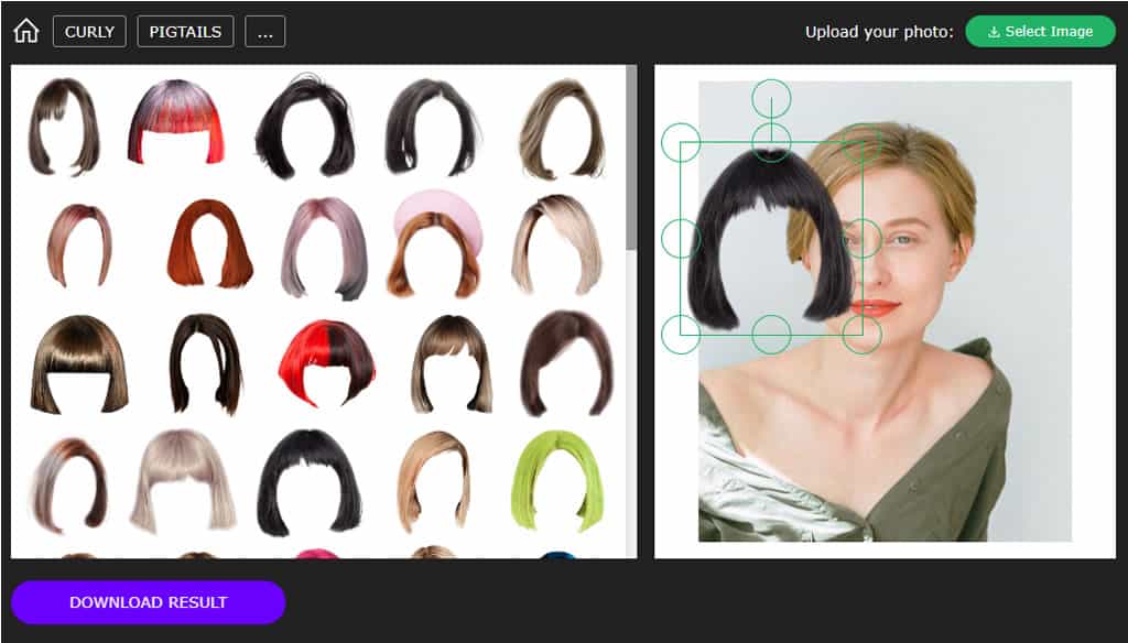 2. 點選想要的髮型種類後,會進入該髮型的列表,同時,右側會出現一個預設圖片讓使用者練習操作。點選髮型就會出現在人物圖片上,可以透過最上面的綠色圓點調整角度,其餘的圓點則可以調整髮型覆蓋臉龐的範圍。