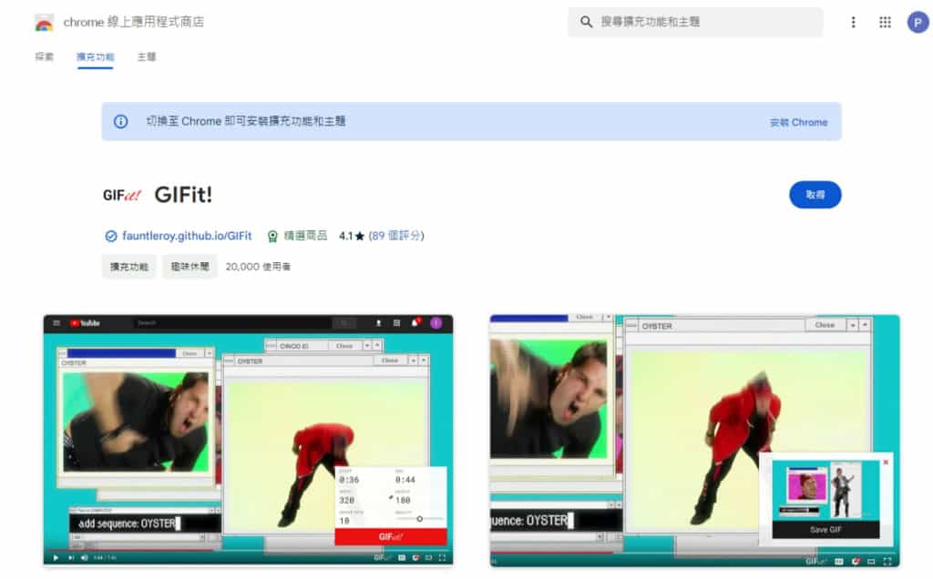 Gif 是一個可以展現動畫的圖檔格式,如果只想引用影片內的片段,將該片段製作成 Gif 動畫圖檔會是種不錯的解決方案。以 YouTube 平台內的影片來說,可以利用 GIFit! 這個瀏覽器擴充功能來輕鬆製作。