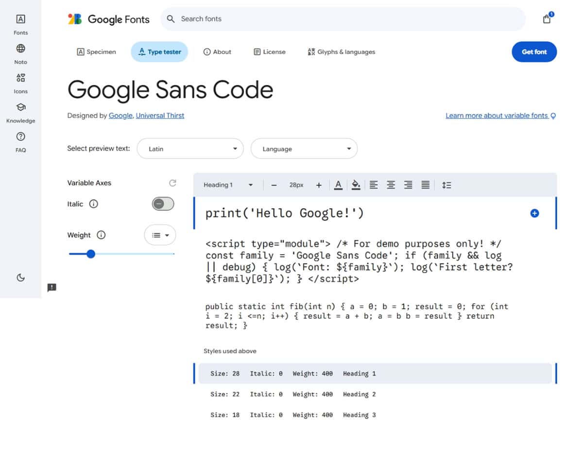 進入 Google Fonts 網站的Google Sans Code 字型頁面,可以看到不同字重、樣式的實際顯示效果,用戶可以設定要測試的文字內容、字體大小。