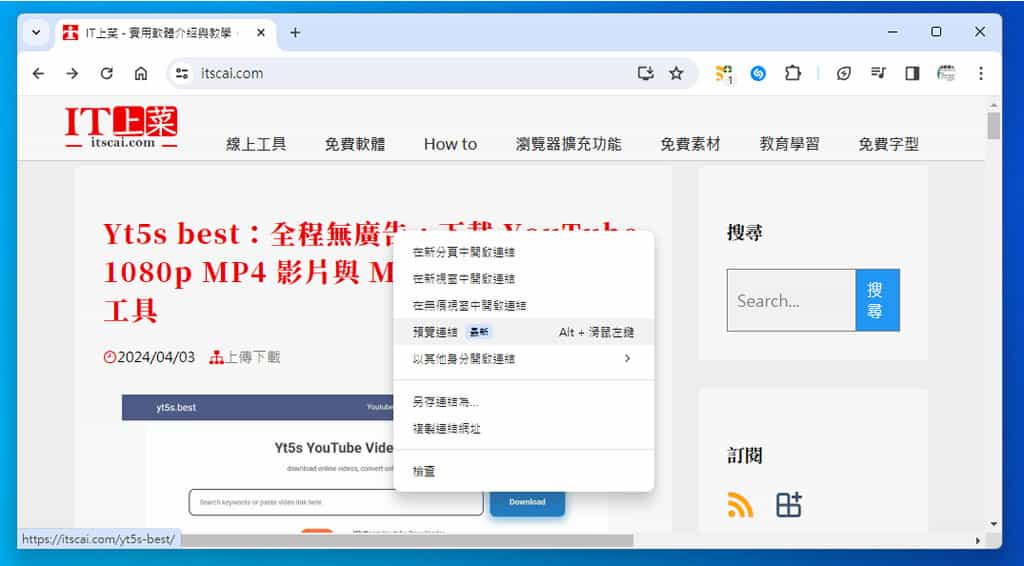 4.當碰到頁面中有連結想使用「預覽連結」功能時,僅需使用滑鼠右鍵點擊該連結,就會出現「預覽連結」功能供點選。