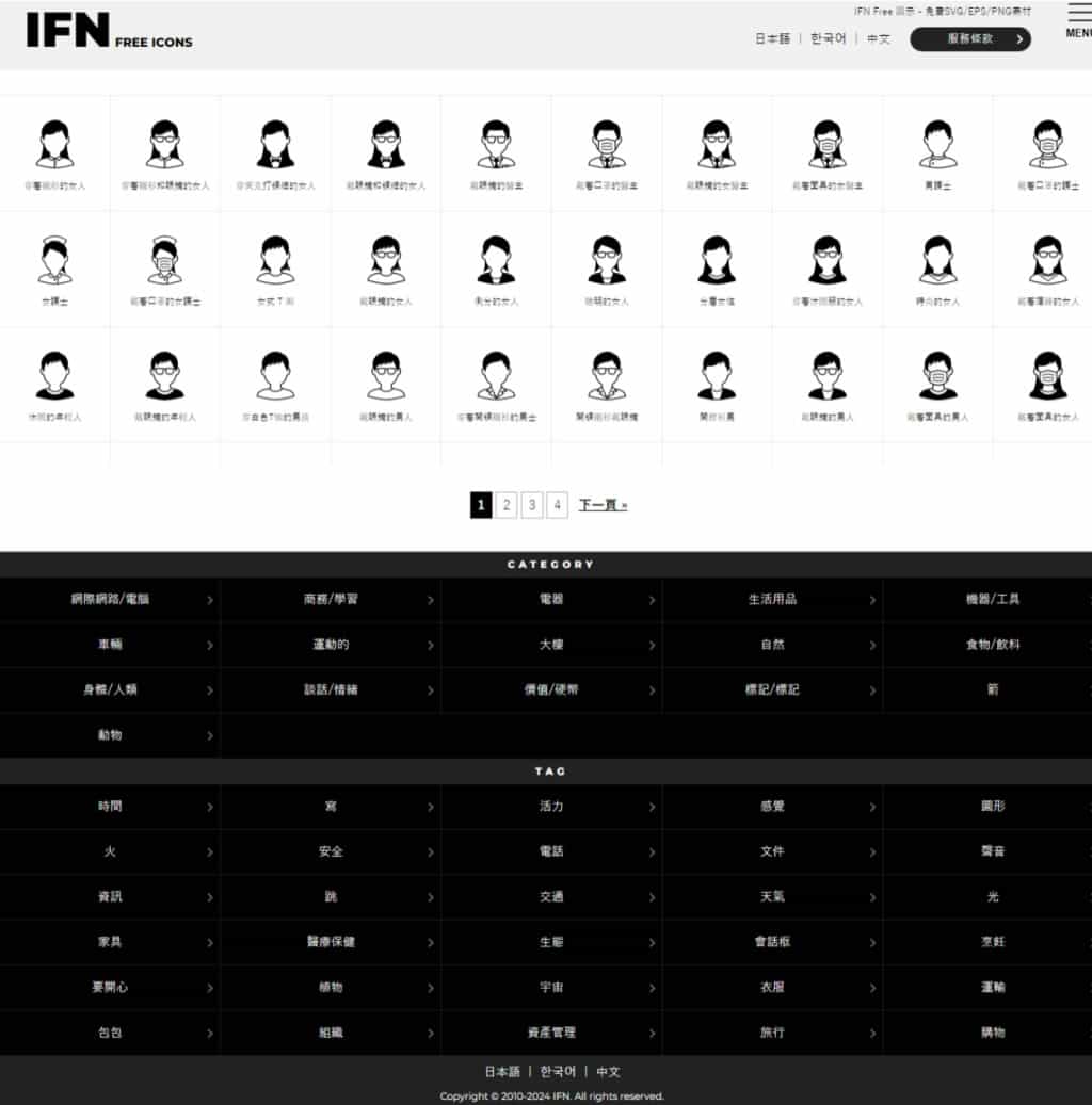 1.IFN Free Icons 提供日文、韓文及中文介面,使用者可自選。透過頁面右上角的目錄圖示按鈕來開啟分類,或是在頁面底部直接點選分類瀏覽圖示。