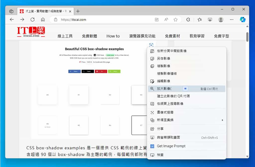 1.使用 Edge 瀏覽網頁時,如果想要放大圖片,可以使用滑鼠右鍵點擊該圖片,在快速功能表中,點選「放大影像」功能,或是滑鼠游標移到圖片上方後,點選 Ctrl 鍵盤鍵兩次。