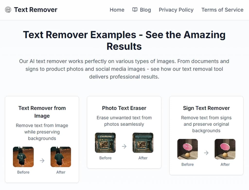 Text Remover 是一個專為圖片文字去除設計的免費 AI 工具,透過先進的人工智慧演算法,自動分析圖片中含有文字的區域,並以鄰近像素進行背景重建,使畫面去字後依然保有自然的細節紋理。不同於傳統僅使用模糊或覆蓋的方式清除文字,Text Remover 能夠根據背景內容自動填補,讓處理後的圖片幾乎無修圖痕跡。