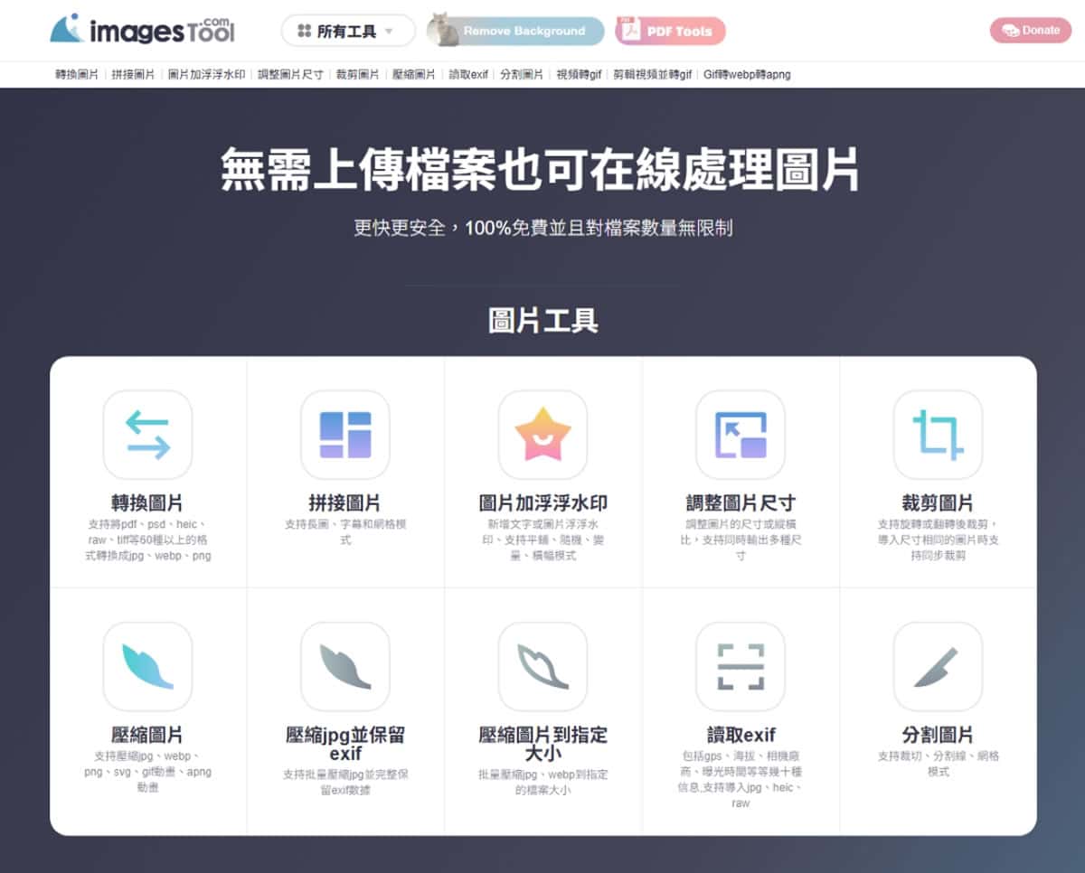 如果你常常需要處理圖片,卻不想安裝笨重的軟體,或是擔心把圖片上傳到陌生網站會有隱私疑慮,這次要介紹的工具應該會讓你眼睛一亮。ImagesTool 是一款完全免費的線上圖片處理平台,涵蓋圖片轉換、壓縮、裁剪、加浮水印、GIF 製作等豐富功能,而且根據官網的介紹,所有運算都在你的瀏覽器本地完成,檔案完全不會上傳到伺服器,是一款對隱私相當友善的工具。