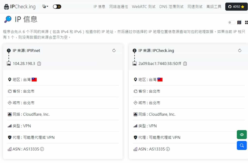 1.使用 IPCheck.ing 查詢及測試時,是以使用者進入該網站的 IP 為主,因此,在進入後就會開始查詢 IP 相關資訊,其來源包含 IPIP.net、Cloudflare、IPify 等服務,可獲得的資訊包含使用者的 IP 位址、地區、城市、ISP、類型、代理或 ASN 等。