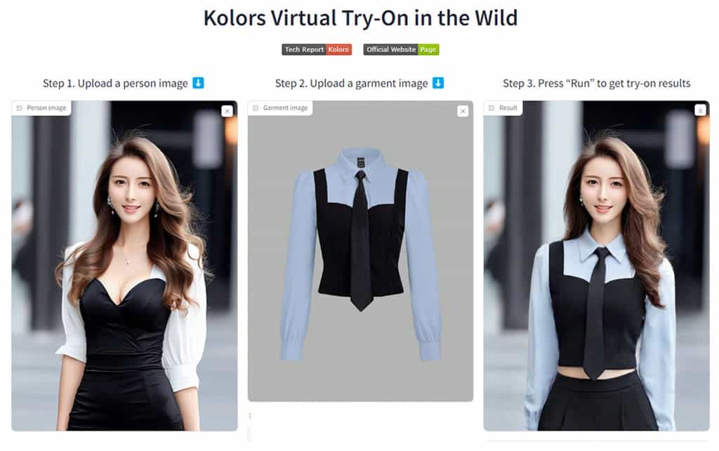 1.進入 Kolors Virtual Try-On in the Wild 網站,僅需要按照頁面提示的三個步驟操作即可。網站也有準備範例圖片,可以自由選用。