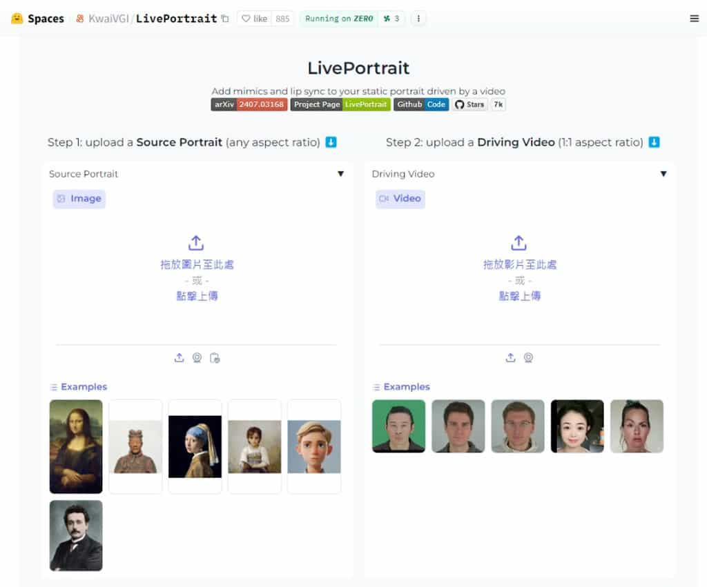1.進入 LivePortrait 工具,左邊是上傳照片,右邊是表情影片,其下方都有範例可供選用。