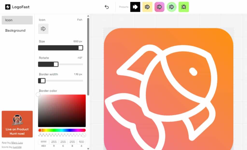 LogoFast 是一個免費的線上標誌產生器,專為快速製作圖示、圖標或 Logo 而設計。使用者利用瀏覽器即可開啟編輯工具,再從內建超過千個的 Lucide 圖示集中選擇圖示後,即可對該圖示進行編輯。編輯的範圍可以調整圖示的形狀、尺寸、旋轉角度、邊框寬度、顏色、背景、陰影和漸層效果,甚至是圓角和填充空間等參數,輕鬆打造出獨特的標誌圖案。LogoFast 操作簡單,即便對圖片編輯技巧不熟悉,也能快速上手。完成後,使用者可將標誌下載為 PNG 或 SVG 格式,且無需註冊帳號,讓使用者即便在沒有專業技能的情況下創造出具有個性的標誌圖案。