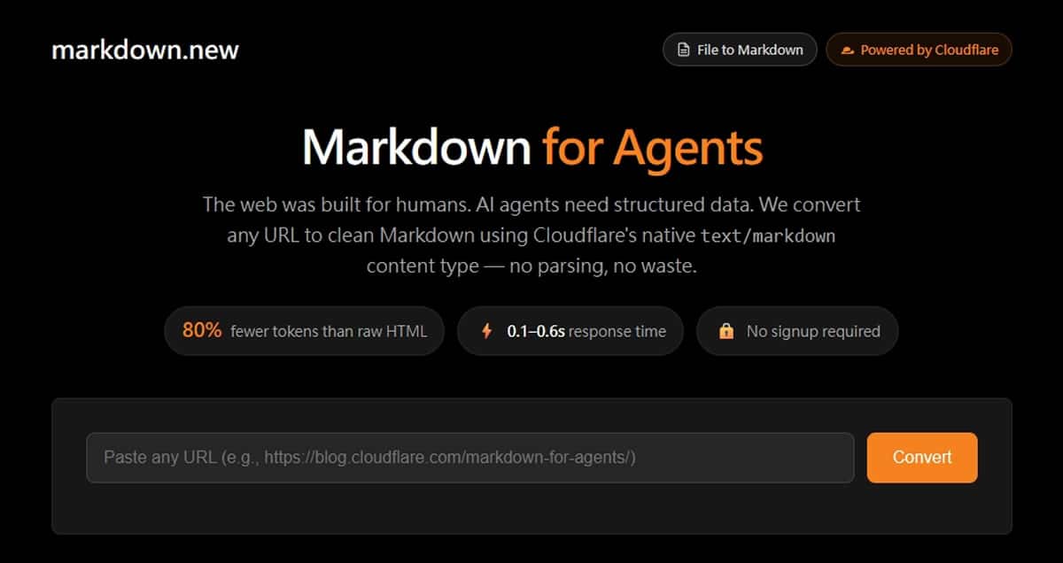 2026 年 2 月,Cloudflare 正式推出「Markdown for Agents」功能,讓啟用 Cloudflare 的網站可以在 AI 爬蟲請求時,自動在邊緣伺服器將 HTML 即時轉換成 Markdown 格式,省去 AI 系統自己解析 HTML 的步驟。這個功能目前仍在 Beta 測試階段,僅限有開啟 Cloudflare 服務的網站才能使用。而 markdown.new 就是以這套底層技術為基礎,進一步打造成任何人都能直接使用的公開轉換工具,不需要自己架設 Cloudflare 也能享受同等的轉換品質。