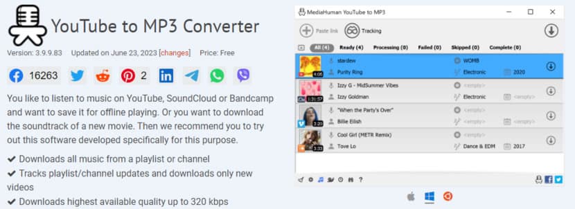 MediaHuman YouTube to MP3 的使用方式如同 Web APP 一樣,僅需貼上影片網址就可以轉出 MP3,其支援大家常用的像是TikTok、YouTube、SoundCloud、Facebook、Vimeo、Dailymotion、Twitter 和 Instagram 等 30多個網站內的影片,且可下載播放列表或頻道中的所有音樂, 且音訊品質位元速率達 320 kbps,且音訊格式不僅支援 MP3,還有 M4A 及 OGG 可供選擇。