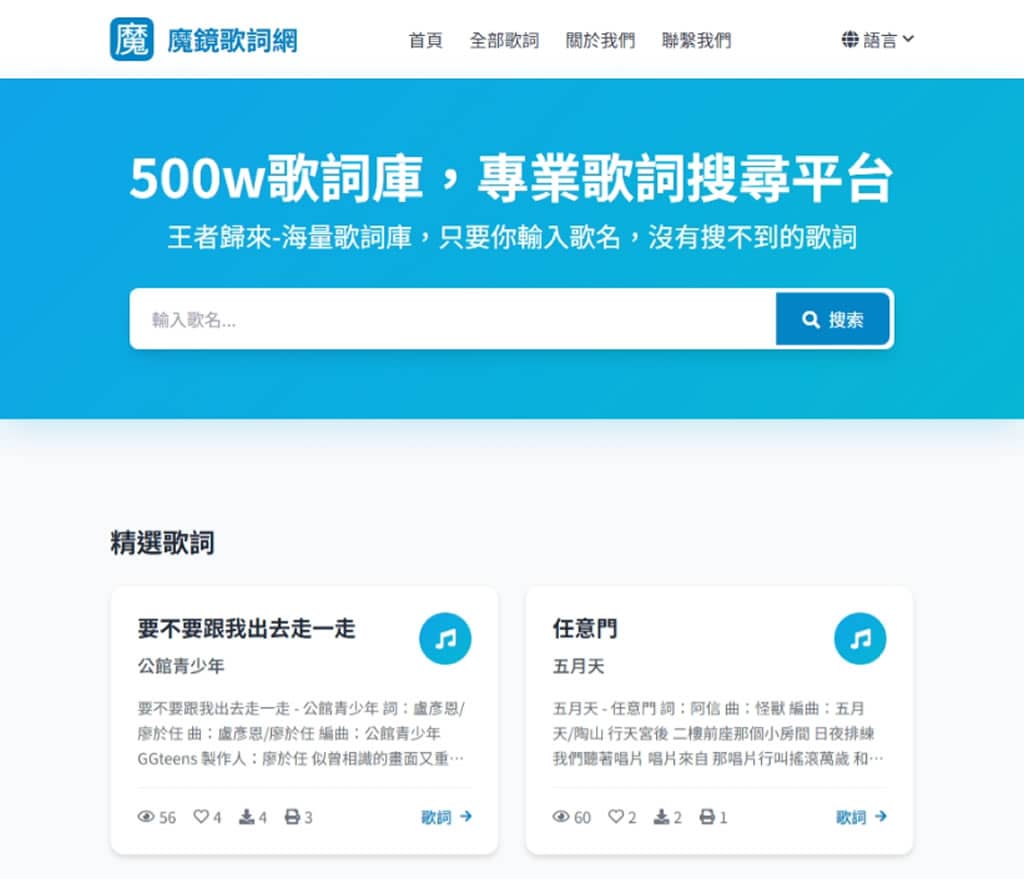 魔鏡歌詞網(mojigeci.com)是一個擁有超過500萬首歌曲的龐大資料庫及專業的歌詞搜尋平台,涵蓋華語、歐美、日韓等各類音樂風格,就像一面神奇的魔鏡,能夠瞬間為使用者找到完美匹配的歌詞內容。無論你是想要找尋經典老歌的懷舊歌詞,還是追逐最新流行歌曲的時尚詞句,魔鏡歌詞網都能提供全面且精準的搜尋服務。