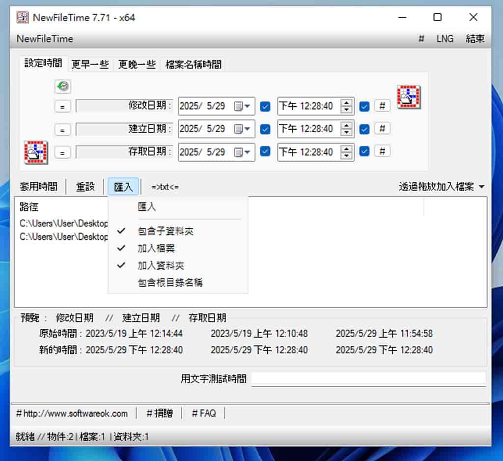 在日常使用 Windows 作業系統時,我們或許很少注意到檔案的「建立時間」與「修改時間」,更不太會去動手調整這些資訊。不過,當文件需要依照時效性排序,或者需要特定的時間戳作為紀錄依據時,這類需求就顯得重要了。這時你可以試試免費軟體 NewFileTime,這是一款專為 Windows 設計的時間戳修改工具,無需安裝、解壓即用,讓你快速修改檔案的建立日期、修改日期和存取日期,還支援批次處理,大幅提升工作效率。