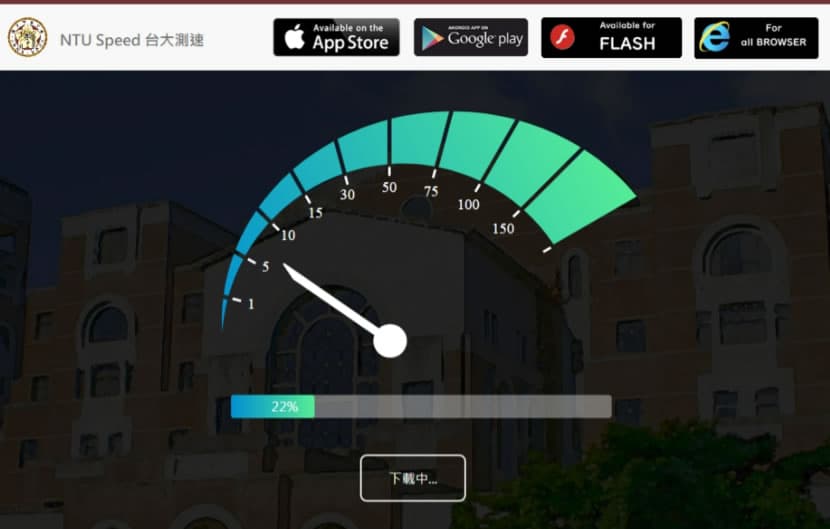1.既然要測試網速,當然就要先將會影響網路速度的應用程式先關閉,以求得更準確的數據,進入 NTU Speed 測速網站後,就可以點擊網頁中間的「開始」按鈕進行網路速度測試,會先從下載速度開始。