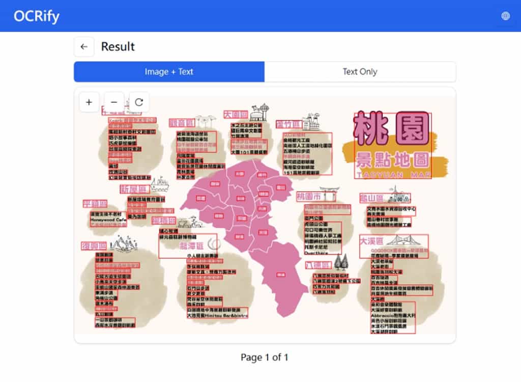 4.以圖片為例,OCRify 會以紅色框線標記出有正確辨識出的文字範圍。