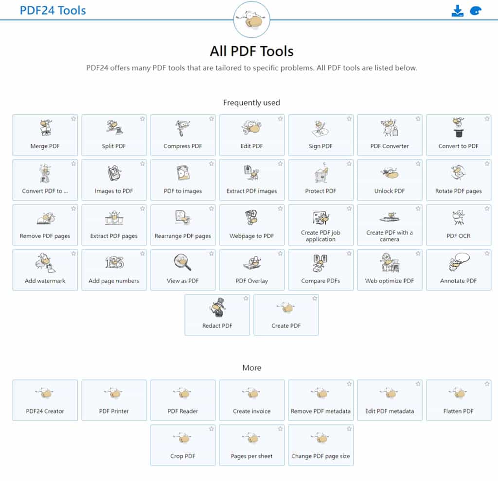 1.進入 PDF24 Tools 網站,頁面會列出工具箱內的所有功能。