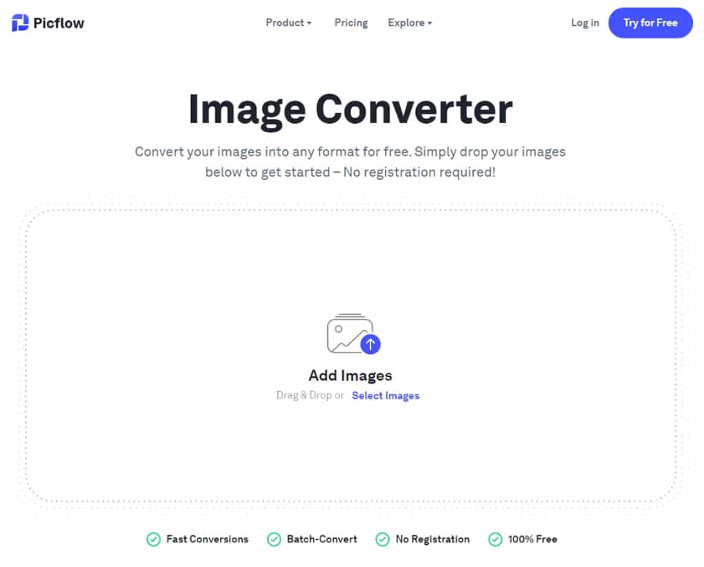 1.進入 Picflow 網站後,將要轉檔的圖片拖曳到頁面中的方框,或點擊「Select Images」選擇圖片。Picflow 支援同時上傳不同格式的檔案,並可一次性將這些不同格式的圖片轉換成相同格式。