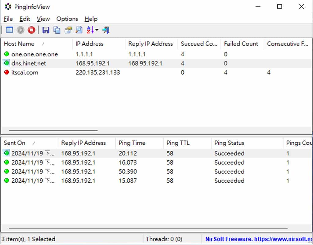 4.PingInfoView 會向 Address list to ping 清單中的每個 IP 或網域發送 Ping 請求,若測試結果顯示失敗,有可能代表該網站無法訪問,或是有可能目標網站禁用 ICMP(Ping)回應。