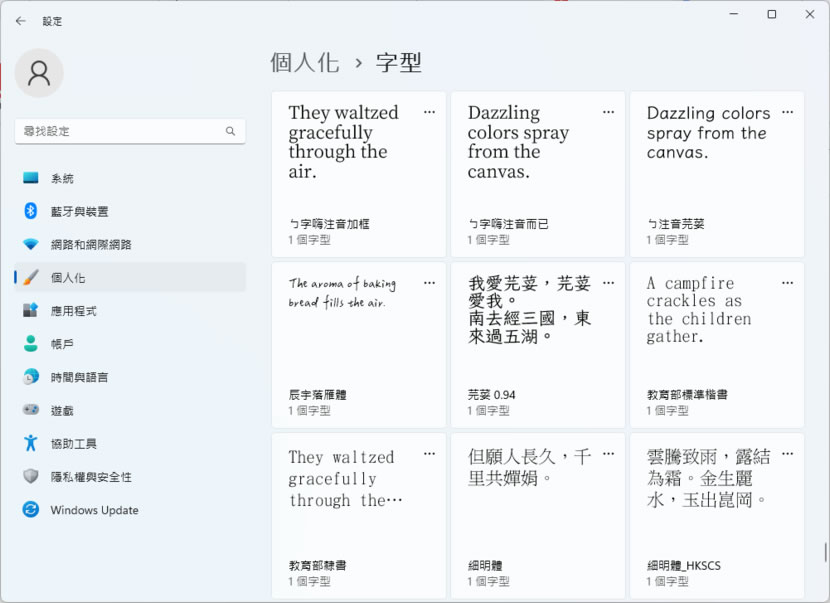 現在 Windows 11 在「設定」>「個人化」視窗中,增加「字型」選項,打開該視窗,我們直接就可以看到所有字型檔內的字型樣式,不需要一個一個檔案開啟才能預覽,讓挑選合適字型變得更一目瞭然,非常好比較,另外,除了預覽,該字型視窗不僅可以預覽字型樣式,還可以安裝及解除安裝字型,讓字型管理變得更加系統化。