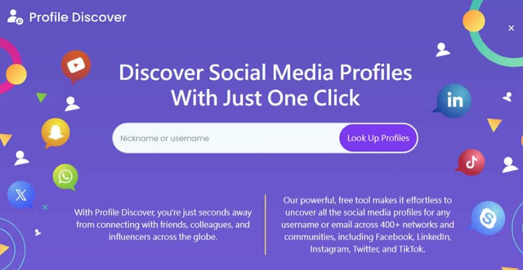 Profile Discover 是一個免費的社群帳號搜尋工具,涵蓋包括 Facebook、LinkedIn、Instagram、Twitter 和 TikTok 在內的 400多個社群網站都是 Profile Discover 搜尋的目標。使用者只需要輸入帳號名稱,Profile Discover即可快速搜尋並列出 400多個社群網站中相應的帳號連結。這使得用戶可以輕鬆地找到所需的社群帳號,並且快速前往該網站確認。但就怕同一人在不同的社群網站會因該帳號已被註冊而必須使用不同的帳號,所以對搜尋結果參考就好。