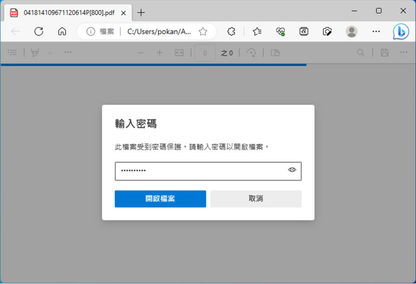 1.無論用何種程式開啟 PDF 檔案,都是需要輸入正確的密碼才能開啟,下圖是使用 Edge 瀏覽器,開啟台電繳費通知單。