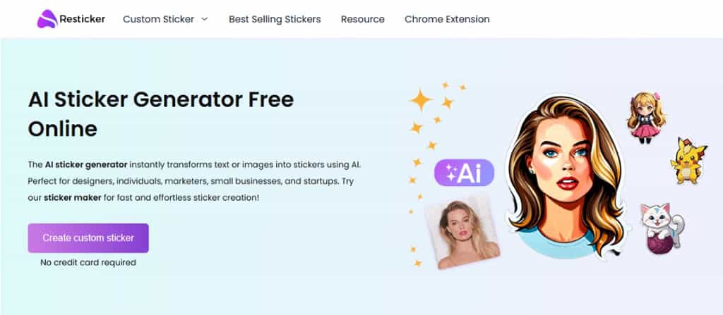 1.進入 Resticker 網站後,點選頁面上方選單中的 「Custom Sticker」,可選擇不同的 AI 貼紙產生器,或是直接點擊「Create custom sticker」按鈕,進入範例頁面來選擇,雖然每種產生器的功能基本相同,但系統會根據選擇提供不同的範例提示,方便你快速上手。