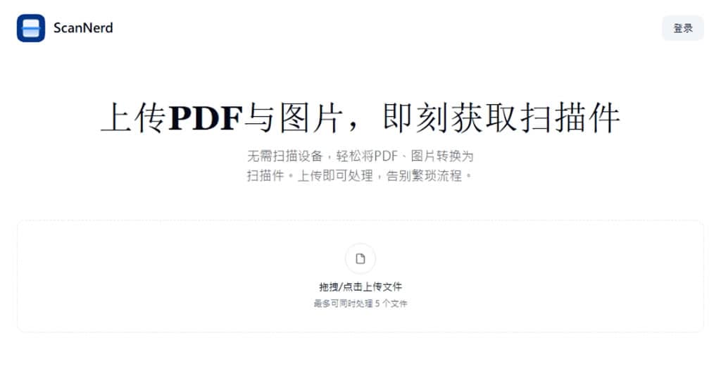 1.進入 ScanNerd 網站,無須註冊,就可以將 PDF 或圖檔使用滑鼠拖曳進帶有「拖拽/点击上传文件」字樣的框內或點擊來選取檔案,一次最多可以處理 5個檔案。