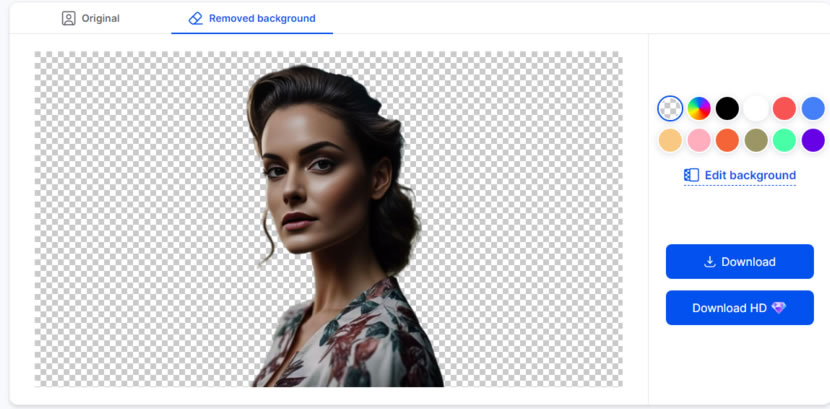 3.如果沒有背景替換需求就可以點擊「Download」直接下載,若想順帶替換背景,可以選擇純色或點擊「Edit background」開啟圖片編輯器來選擇網站所提供的背景圖或自行上傳要做為背景圖的圖片。