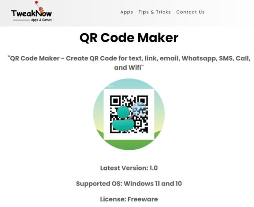 TweakNow QR Code Maker 是一個免費的桌面應用程式,專用於生成二維條碼。透過格式化的內容,我們能夠快速生成包含 text、link、email、Whatsapp、SMS、Call 和 Wifi 的 QR Code。對於已生成的 QR Code,該工具還提供了更改尺寸、顏色和邊界間距的功能,最後可以下載成 PNG 圖檔,方便嵌入到網站或平面媒體中使用。