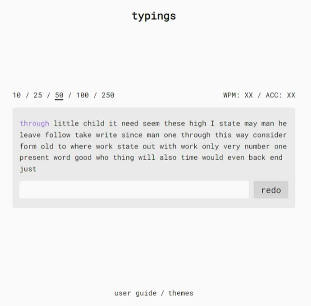 Typings 是一個免費的線上英文打字練習工具,旨在幫助使用者提高打字速度和準確率。使用非常簡單,只需打開網站,按照頁面上的提示輸入英文單字即可開始練習。每次練習結束後,系統會自動生成報告,顯示練習者的打字速度( WPM)和準確率(ACC)。這些數據能有效協助練習者了解自己的打字程度。Typings 預設每次練習為 50 個單字,但根據不同的需求和目標,網站還提供 10、25、100 和 250 個單字的選擇,讓練習者可以根據時間與程度找到合適的練習模式。
