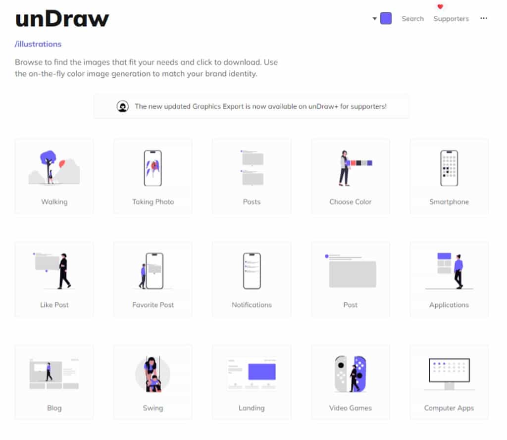 1.進入到 unDraw 網站,不需註冊,就可以開始瀏覽所有插圖。